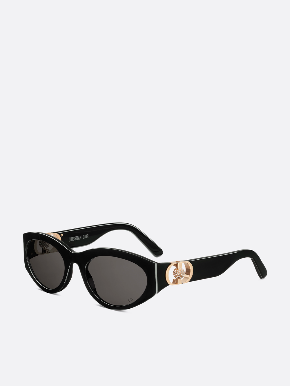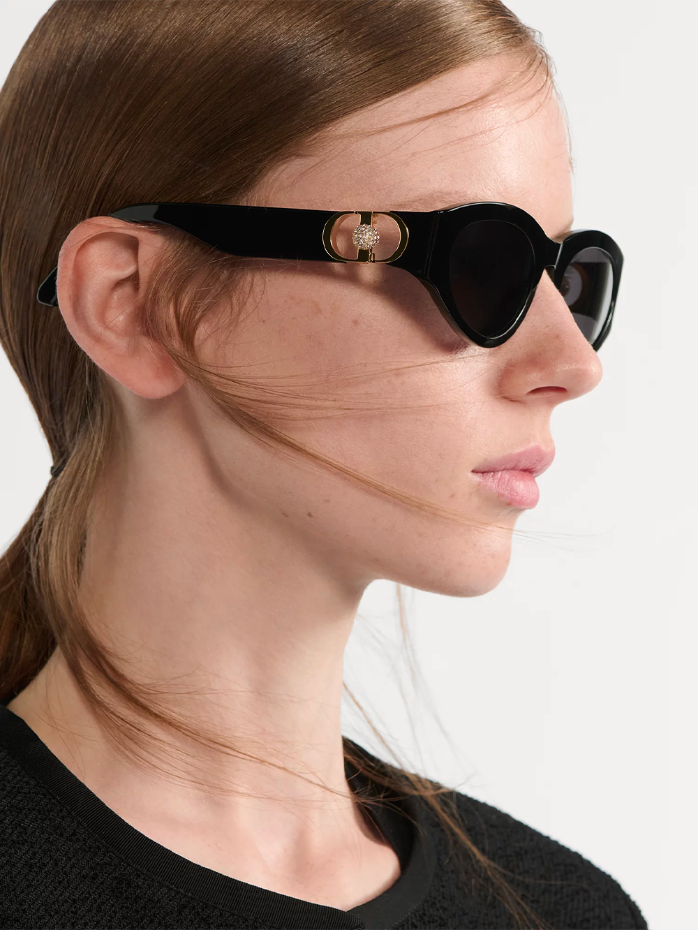 The 30Montaigne B7I sunglasses enhance the line with a sleek butterfly shape and urban elegance. The black acetate frame reimagines the functional CD signature hinge in gold-finish metal with a bead at its center covered in Swarovski® crystals. Completed by gray lenses, the style will lend a couture touch to any look.