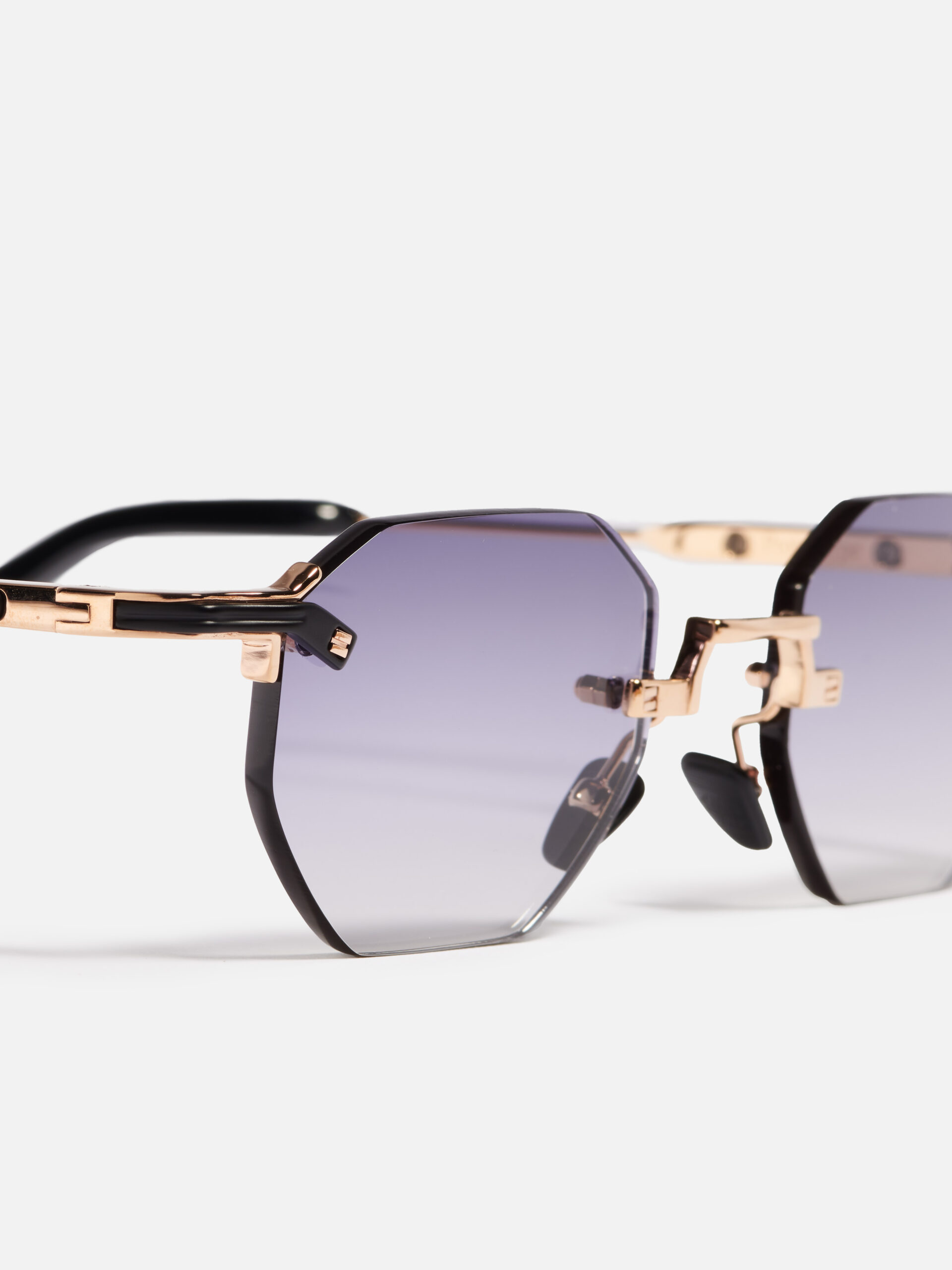 Unisex rimless frame in a hexagonal shape, featuring decorative titanium inserts on the temples and end pieces. The frame is equipped with titanium nose pads and thick acetate temple tips.