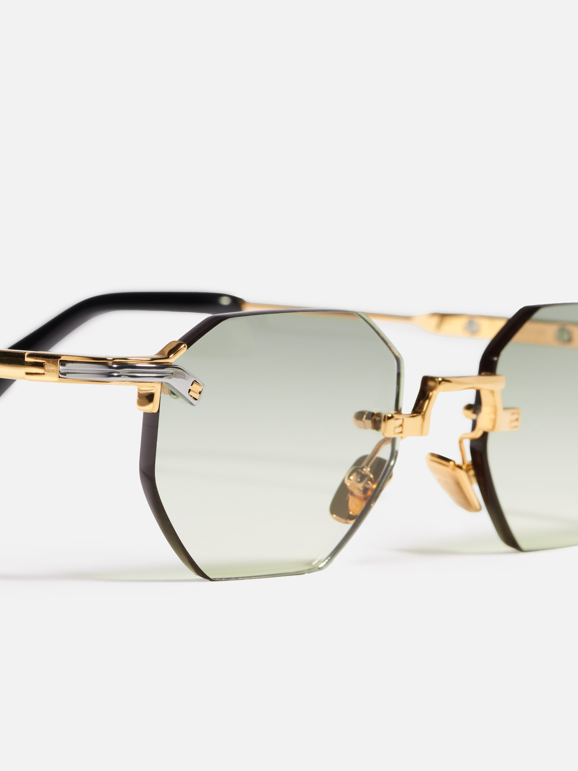 Unisex rimless frame in a hexagonal shape, featuring decorative titanium inserts on the temples and end pieces. The frame is equipped with titanium nose pads and thick acetate temple tips.