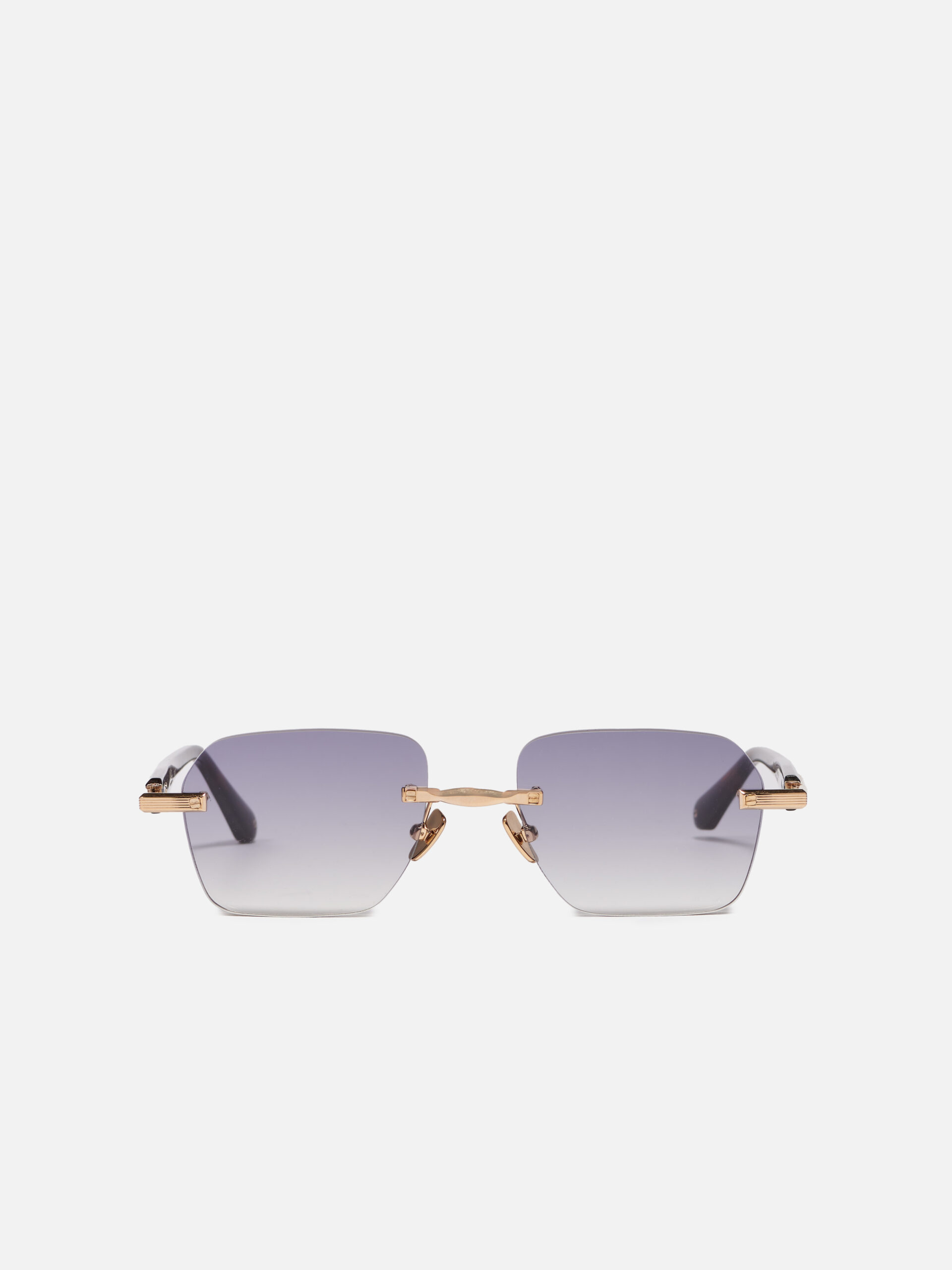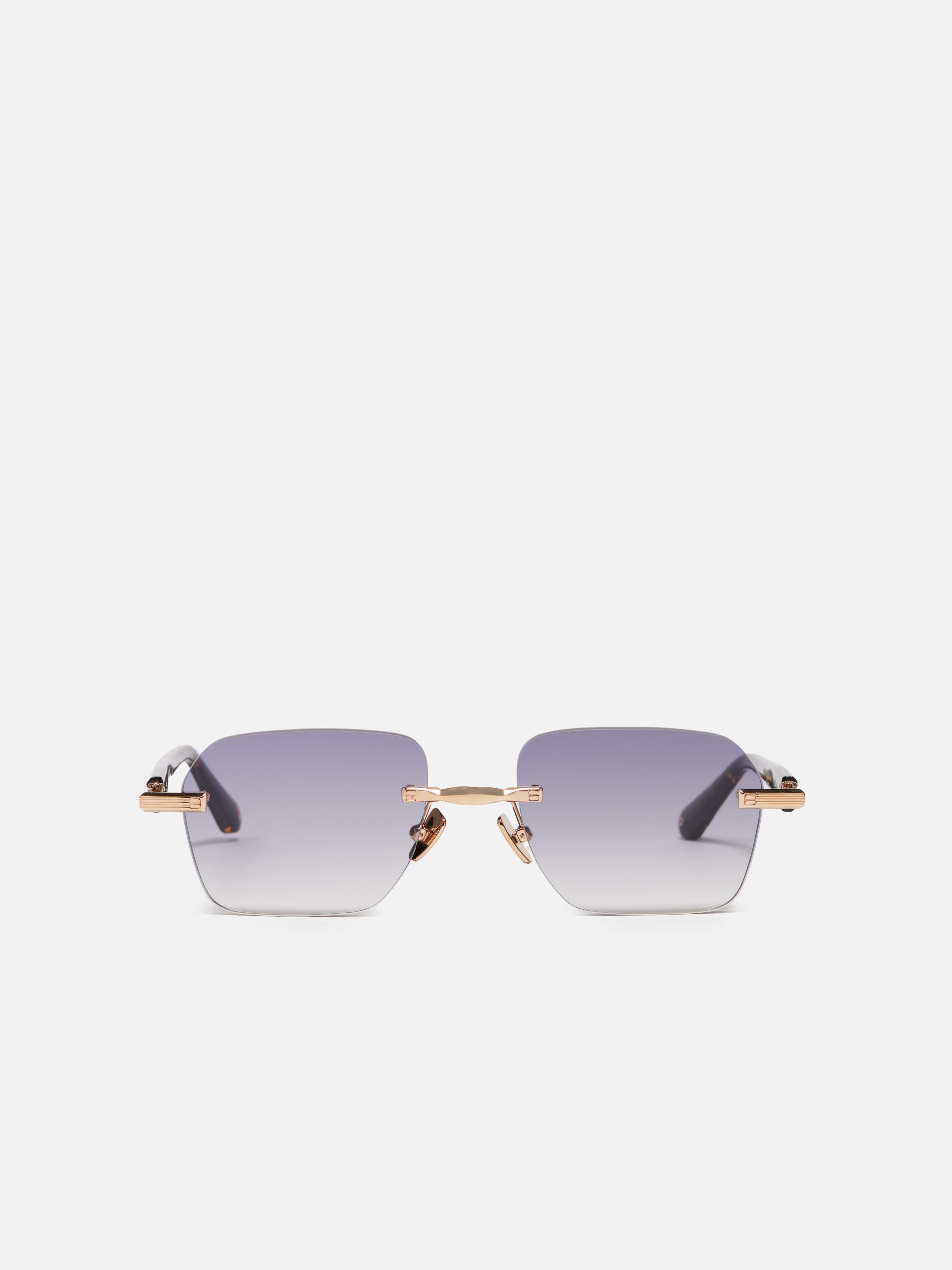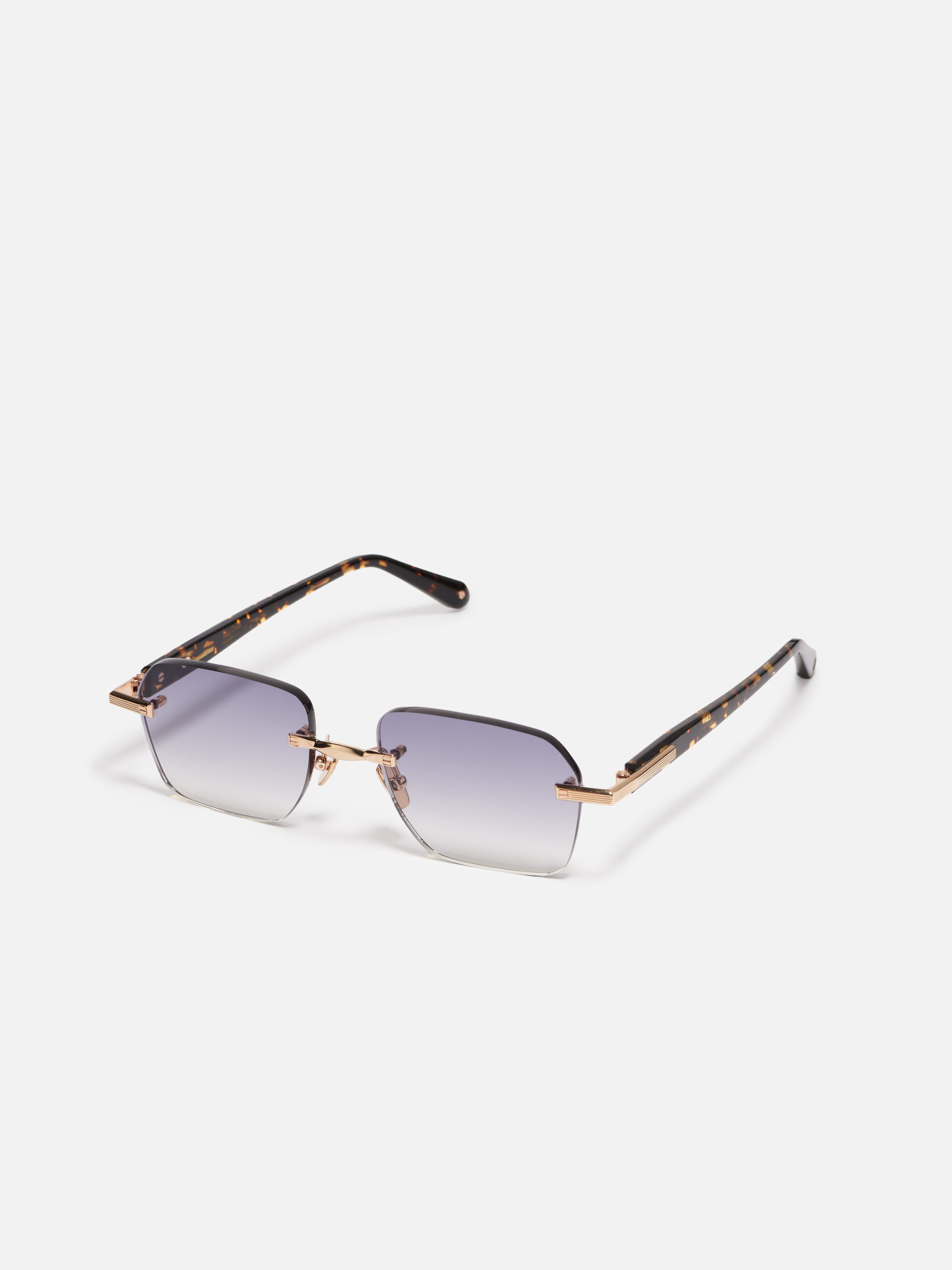 Unisex rimless frame in a rectangular shape. The frame is equipped with a wide, grooved bridge and end pieces. The glasses feature extended acetate temple tips.