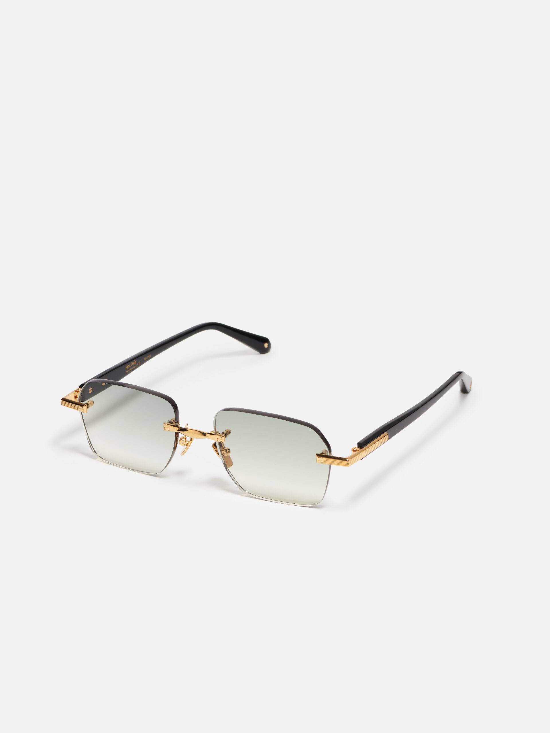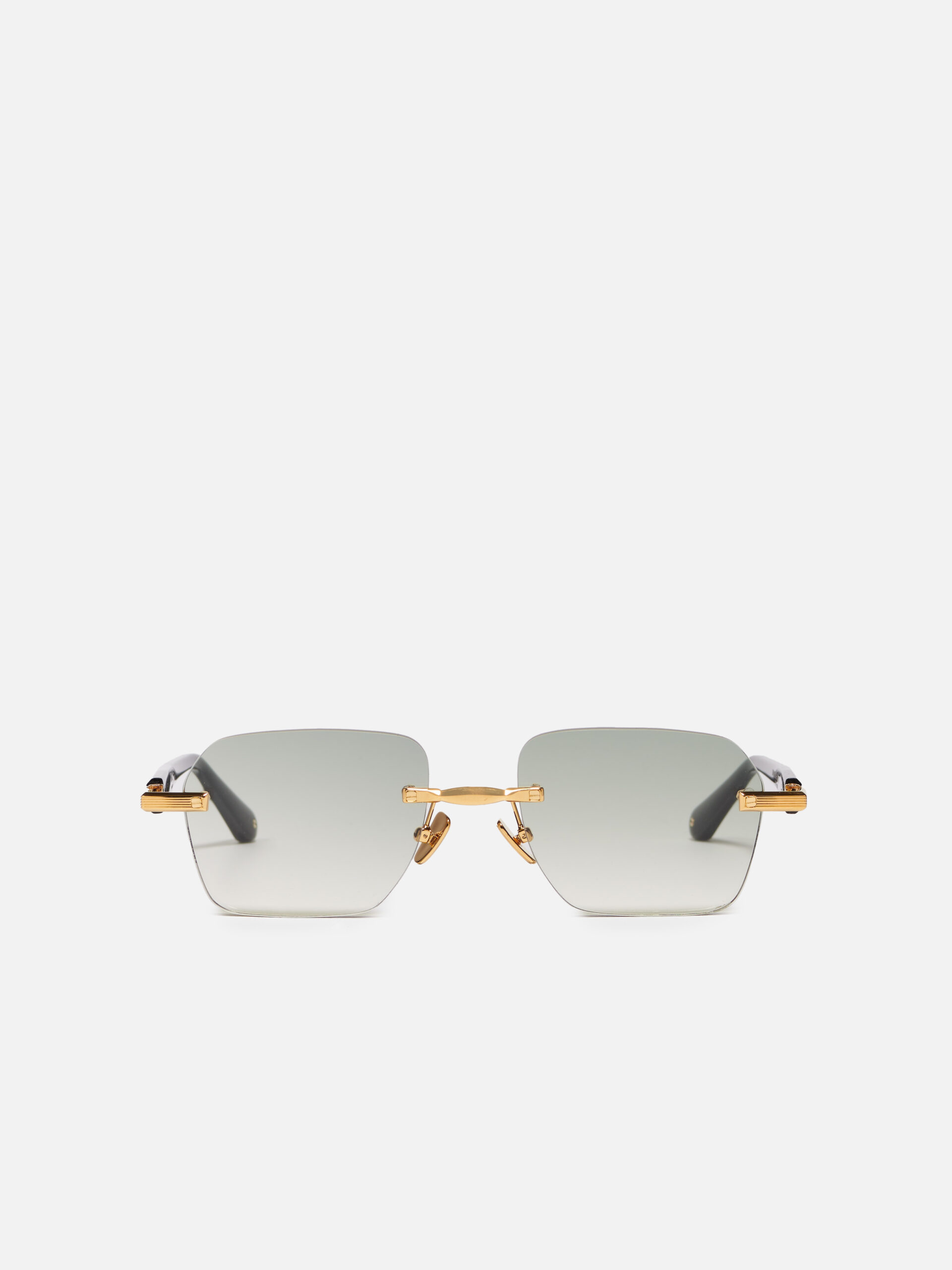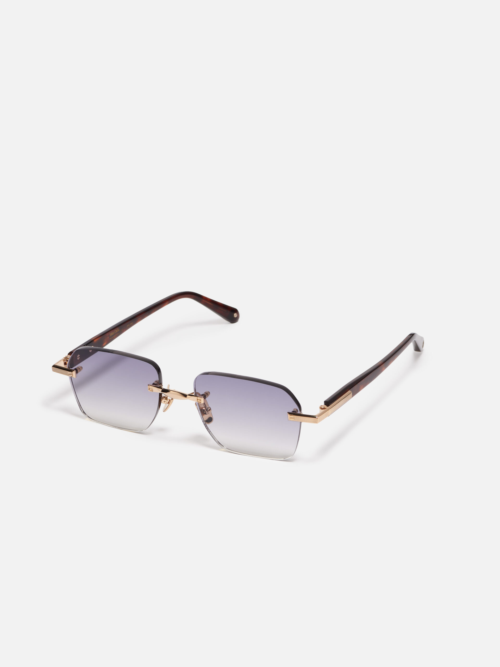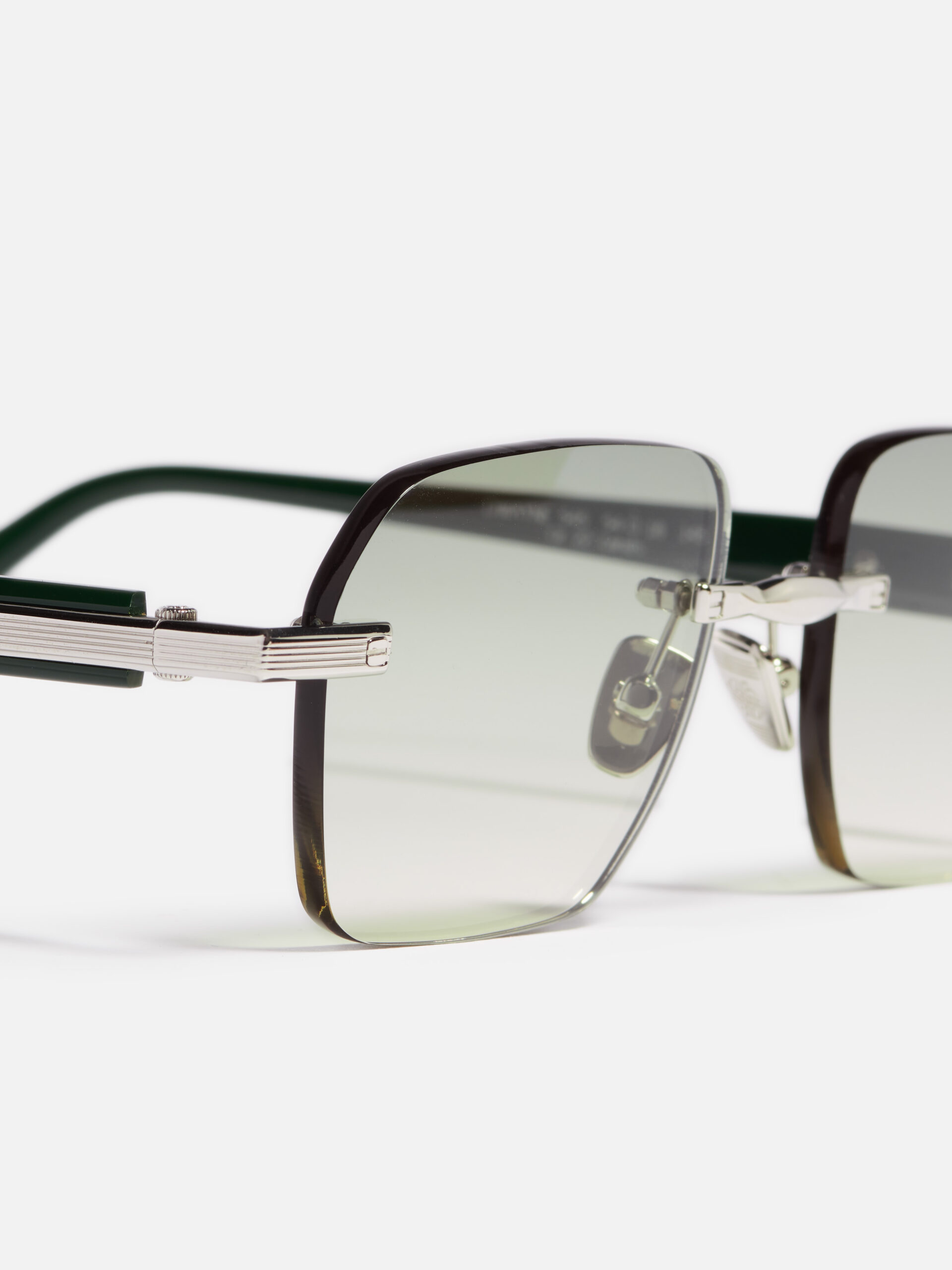 Unisex rimless frame in a rectangular shape. The frame is equipped with a wide, grooved bridge and end pieces. The glasses feature extended acetate temple tips.