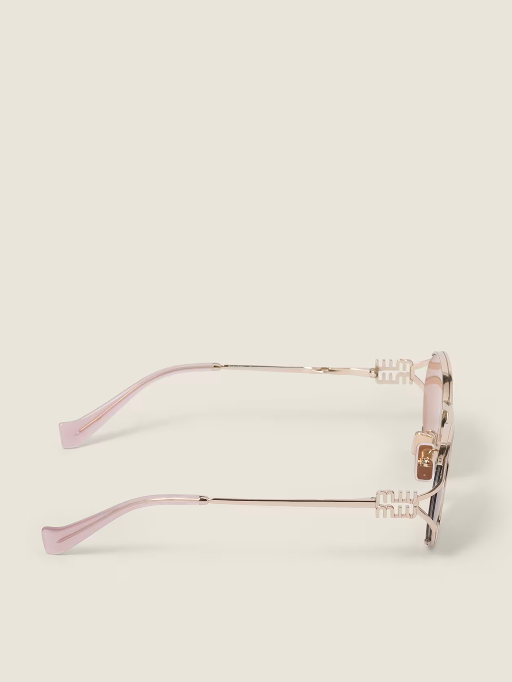 Metal sunglasses with sophisticated allure. The frame is emphasized by thin metal rims that separate from the trendy oval lenses before meeting up again to create the new vertical Miu Miu logo integrated into the hinge of the straight temples.